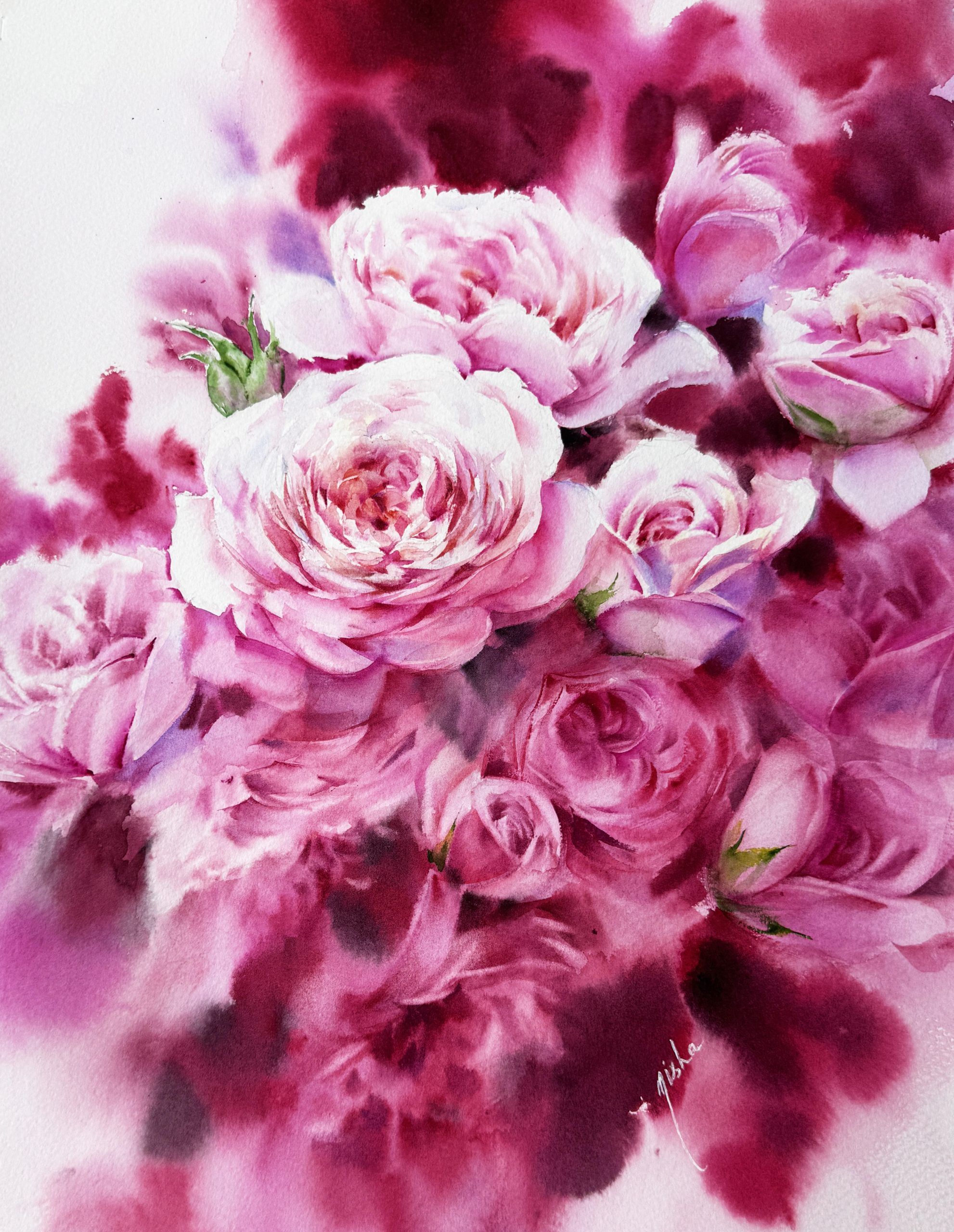 Original watercolor painting of Velvety Roses created on an atmospheric background.