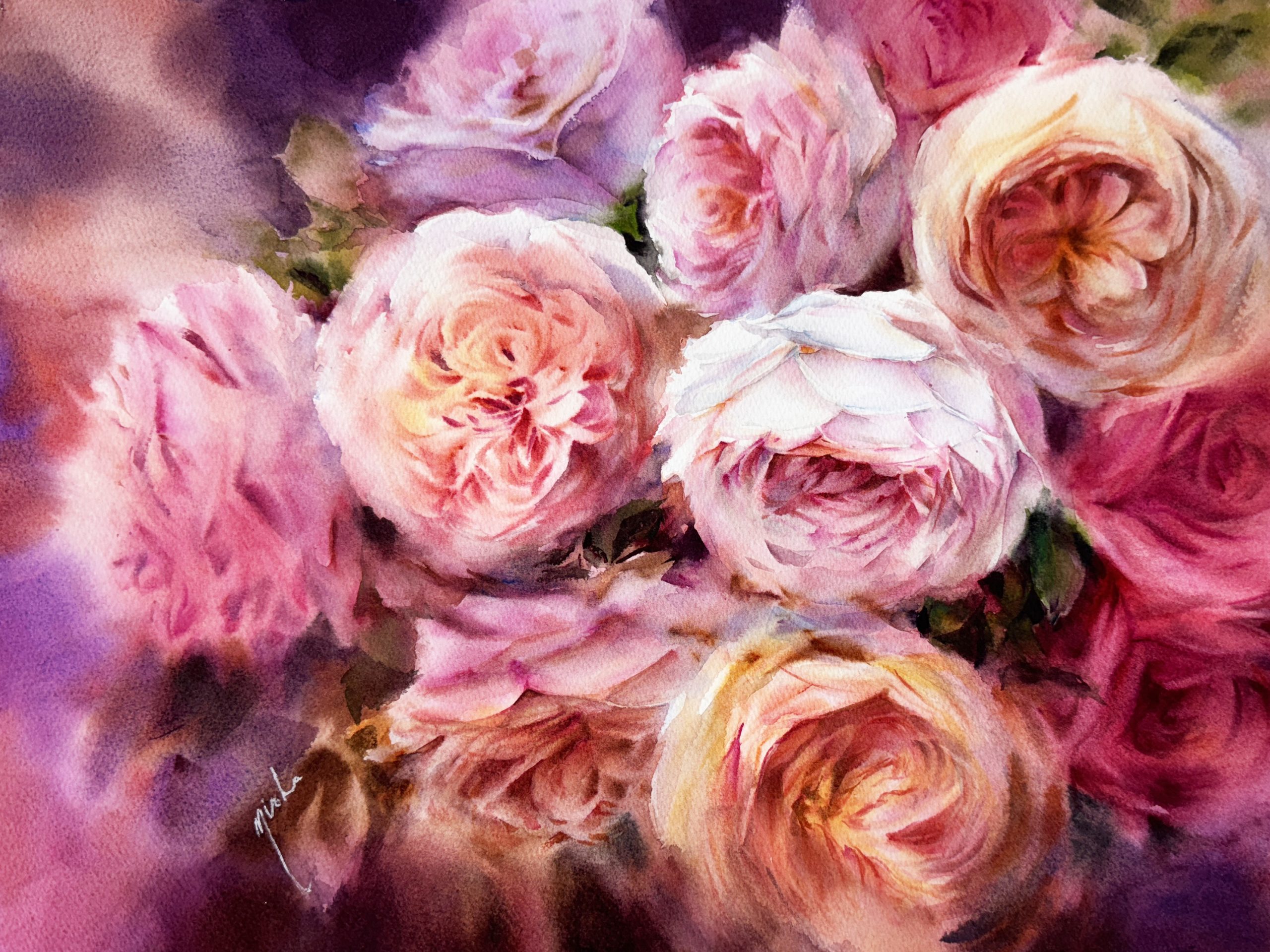 Original watercolor painting of Roses created on an atmospheric background.